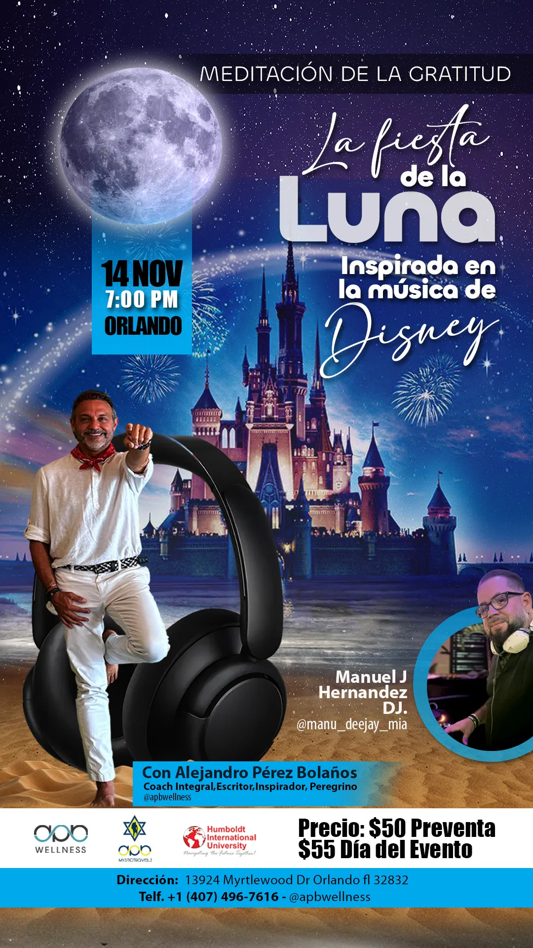APB Wellness 13924 Myrtlewood Dr,, Orlando, Florida, United StatesLa Fiesta de la Luna: Meditación de la Gratitud (Orlando) DESCRIPCIÓN🌕✨ Fiesta de la Luna: Una Noche Mágica de Luz, Música y Meditación, bajo la luna y las estrellas y usando audífonos lo que te llevará a una conexión profunda con tu ser ✨🎶 La Fiesta de la Luna te invita a una noche de...